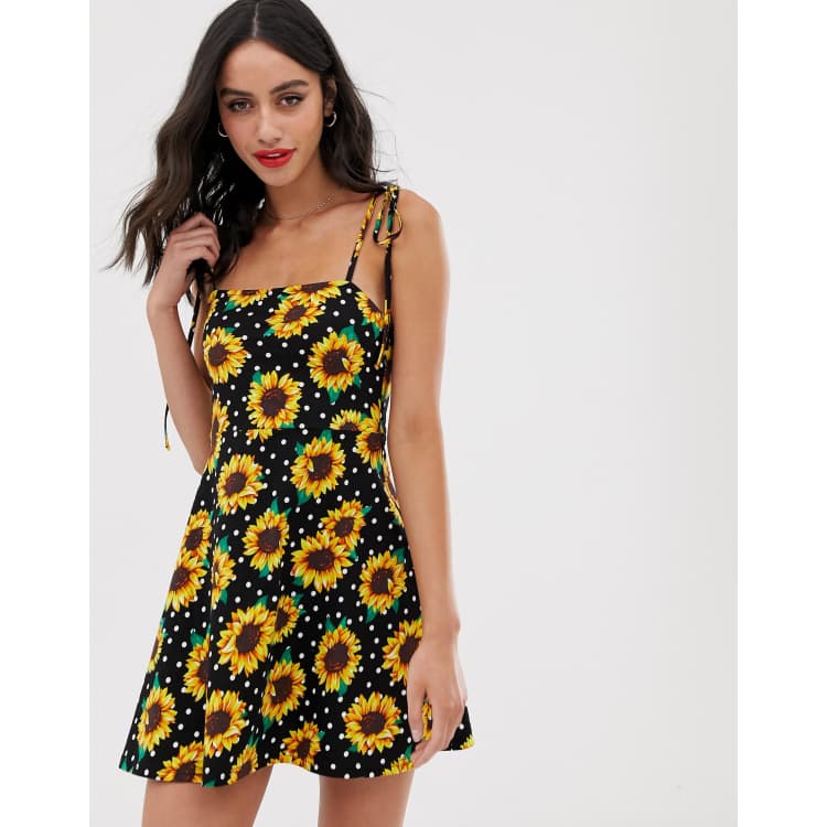 ASOS DESIGN mini square neck dress with tie straps in yellow sunflower spot print Very well made.