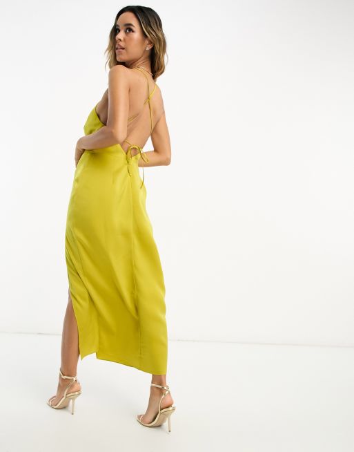 ASOS DESIGN tie front satin midi dress with flared sleeve and cut out side in yellow Very well made.